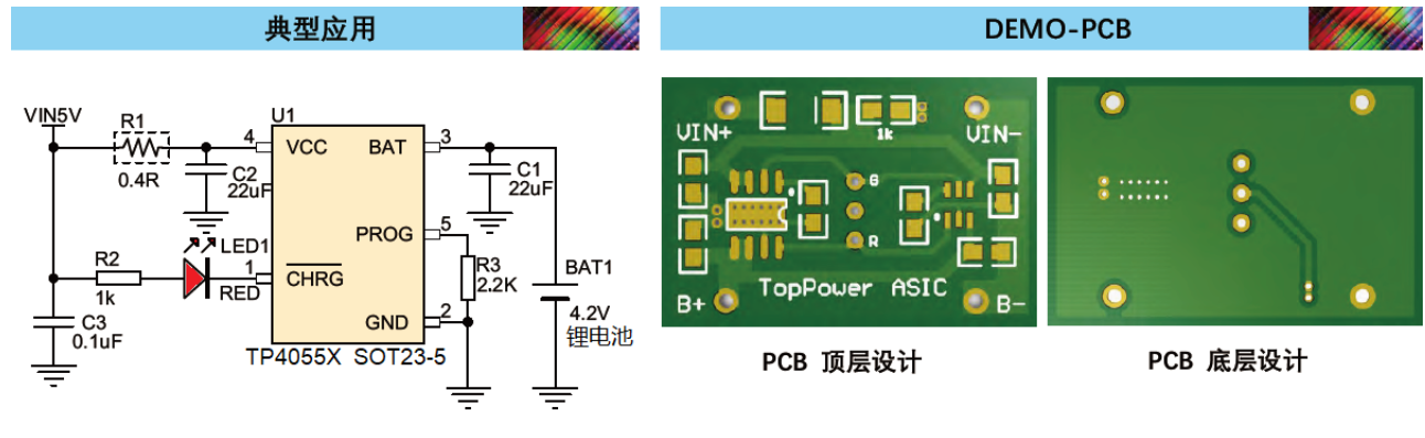 当输入电压(交流适配器或USB 电源)被拿掉时,TP4055X 自动进入一个低电流状态,电池漏电流在2uA 以下。TP4055X 的其他特点包括充电电流监控器、欠压闭锁、自动再充电和一个用于指示充电结束和输入电压接入的状态引脚。